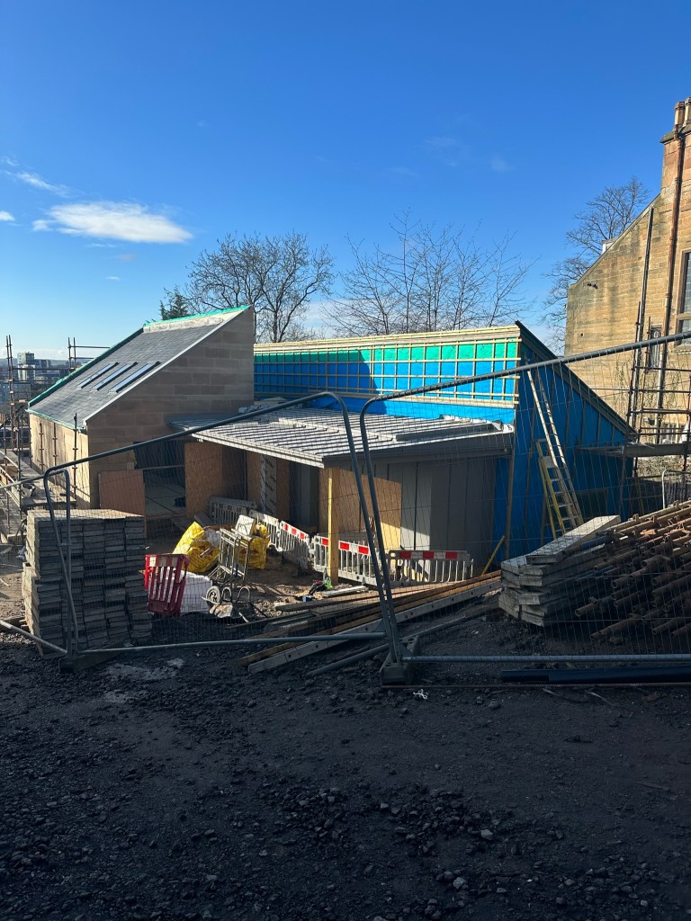 Block and beam floor installed with timber kit making up internal structure of upper. Continuation of coursed ashlar sandstone tied into kit and finished at roof peak.